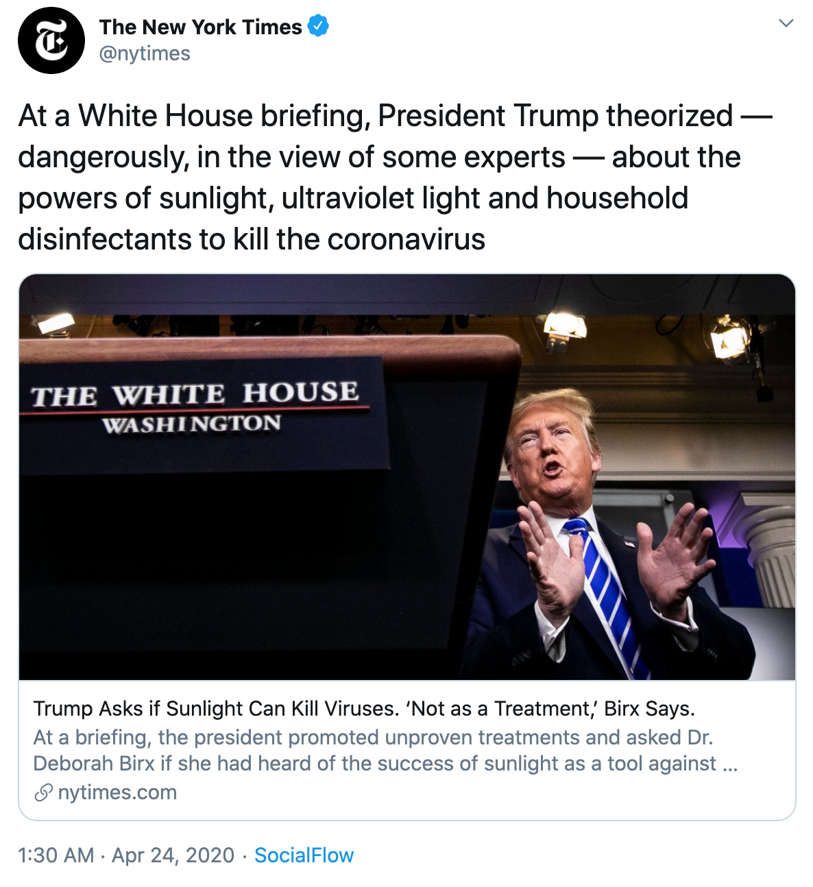 The tweet and its accompanying story refer to the instantly infamous moment on Thursday when Trump began musing aloud about whether COVID-19 can be combated with ultraviolet light and an “injection” of disinfectant in the body. Here is some of what he said: