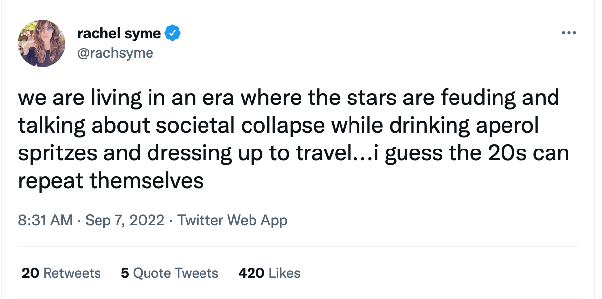 For me, this spectacle will sit at arm's length as the perfect, delicious morsel of drama. I care just enough to engage, but not so much that I have any personal stakes. It’s harmless chaos (assuming no actual suffering was inflicted, and these are just hot people who really do not get along). More than anything, I feel warmth from the fact that it seems to further confirm what’s been in the air for a while now: a golden era of celebrity gossip is upon us. During the height of COVID, sad king Ben Affleck shouldered much of the burden, along with Ana de Armas, Jennifer Lopez, and Dunkin’ Donuts. We are grateful for his service, but there’s a kind of mayhem brewing right now that we haven’t seen in years. People have changed, have cracked, have fewer fucks to give, are more resolute than ever before, are ready to feel the full weight of interpersonal drama. People have been forecasting the roaring 20s of the new millennium for a few years now, and maybe it’s actually upon us.