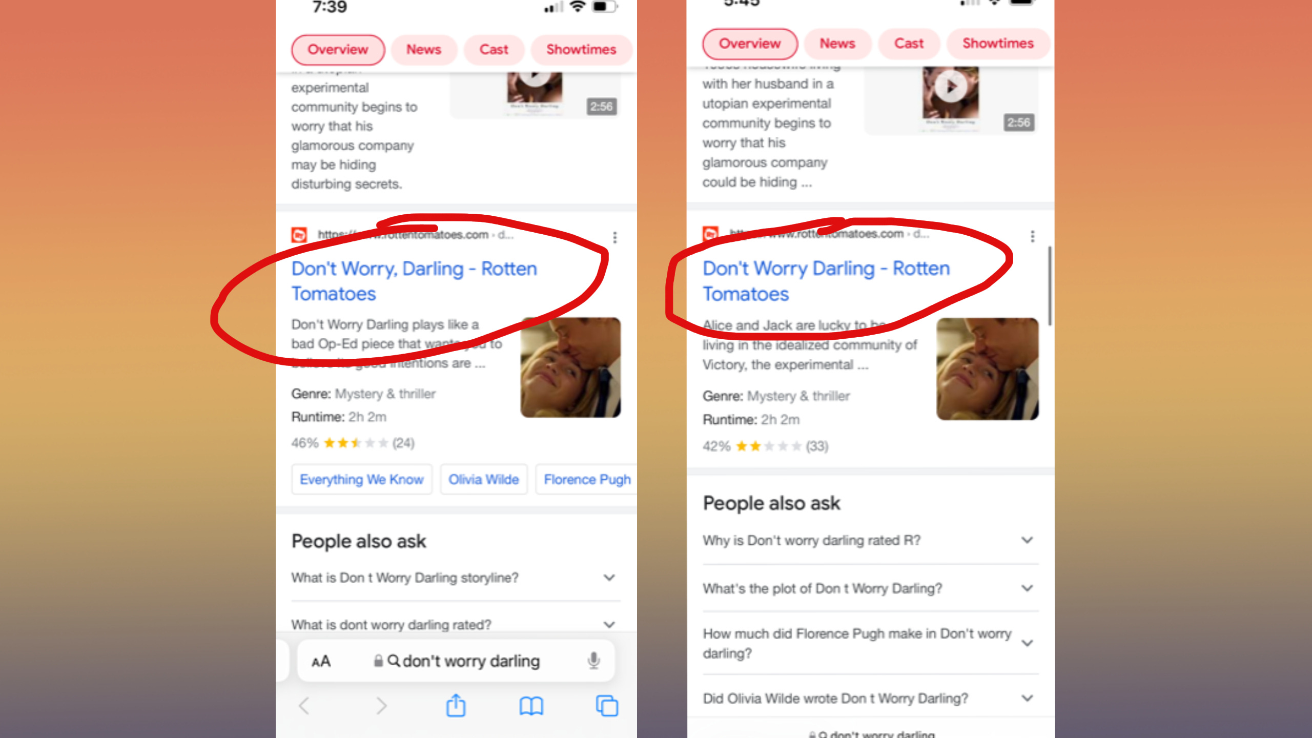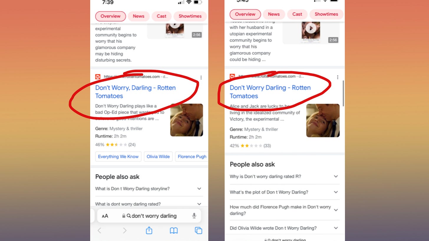 This isn’t really relevant, but as an aside, I’m heartbroken to say that Rotten Tomatoes—which as of this morning was in on the drama by insisting on adding the necessary comma in the title—has since edited the page for the “correct” but wrong styling of Don’t Worry Darling. If there is a reason this title has no comma, I would actually like to know it: