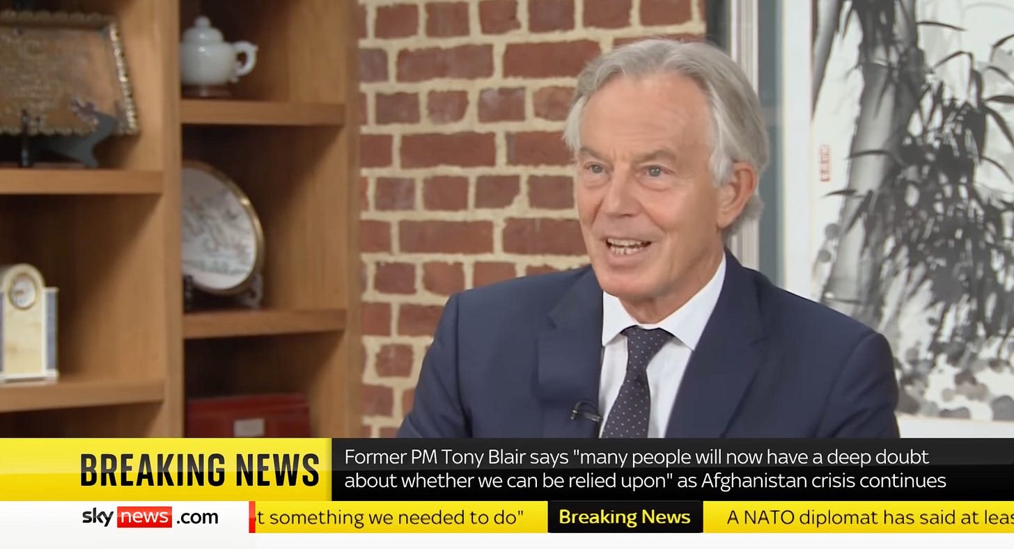 You can feel that sense of total unease in two very Distinguished interventions in the debate over the weekend—one from former U.S. ambassador to Afghanistan Ryan Crocker, and another from former British prime minister and black card member of the War Criminal Club Tony Blair. Crocker wrote an impassioned op-ed for the New York Times, and Blair wrote an impassioned op-ed on his own website. Both are suffused with a kind of imperialist grief, and both rage at the idea that the U.S. and its allies should not be in Afghanistan forever. ("We didn't need to do it. We chose to do it. We did it in obedience to an imbecilic political slogan about ending 'the forever wars,'" Blair sneers.) Both also play on the theme that the withdrawal suggests a dangerous new turn in world history, where America and the "West" flash warning signs about their own decline. Here's Blair: