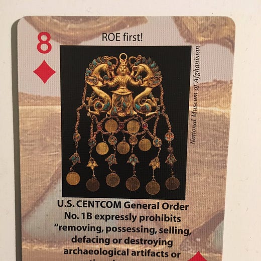 The United States didn’t actually ratify the convention until 2009, but it signed back in 1954, and the concept has been part of official U.S. military policy since even before then, extending to the modern era in which American troops were given packs of playing cards to identify culturally significant sites in Iraq and Afghanistan: