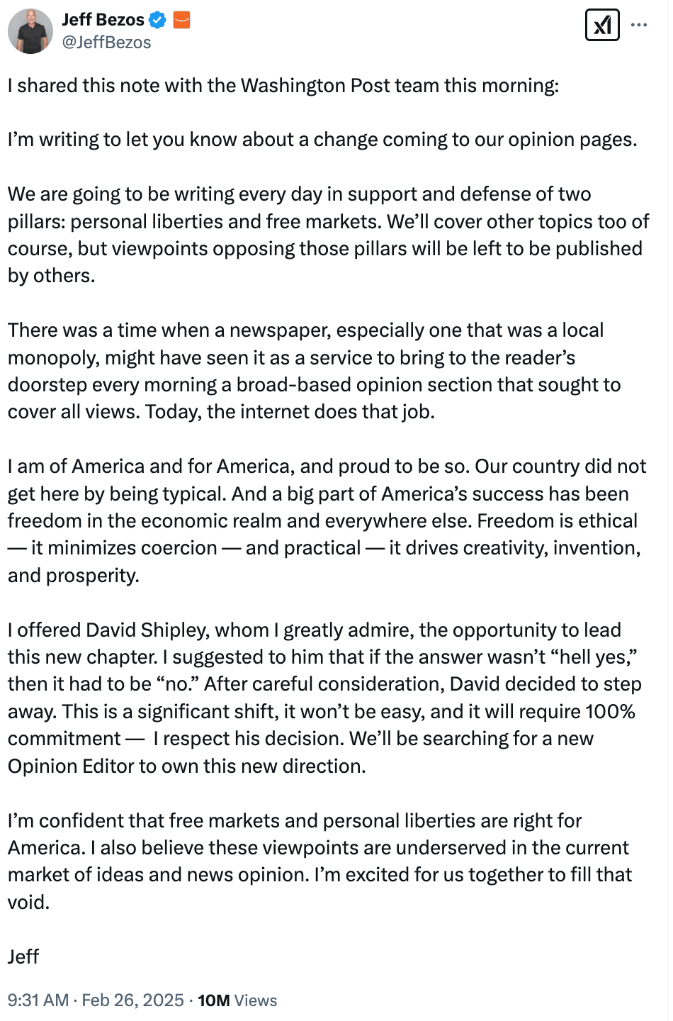 It’s cover both ways: if Bezos catches flak for being too Trump-aligned by a foreign partner or domestic actor he still needs to deal with, he can point to the Post’s adversarial reporting as evidence that he’s not a true devotee. When said reporting pisses off the administration, Bezos can just toss Kash Patel or whoever a full-page op-ed. This is generally how the Murdochs have played it with the Wall Street Journal for years, so while we’re not necessarily in uncharted territory, I do think it’s significant that Bezos now feels empowered enough to make it explicitly clear that he is going to pursue the same strategy at the Post.