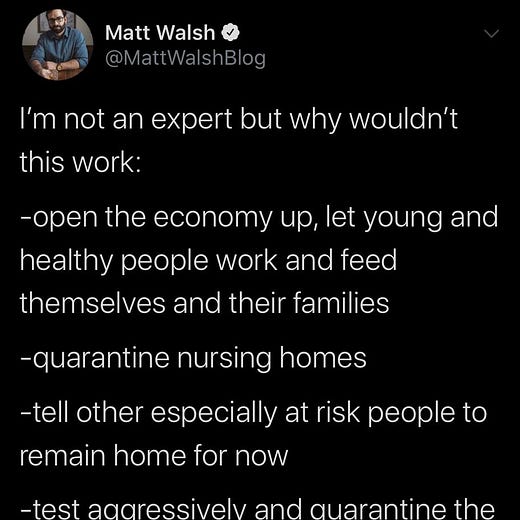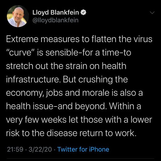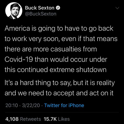 This kind of "debate" will surely ramp up as the hardships of isolation and social distancing go on. More and more people will start to wonder whether all of this misery is really worth it when most people who get coronavirus will be alright in the end.