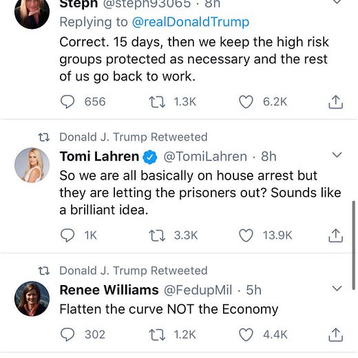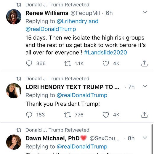 This point of view is shared by, among other people, the president of the United States, who has spent the last 14 or so hours feverishly signaling that he is getting tired of telling people he wants to help keep them safe and wants to tell them to start going back to work pretty soon.