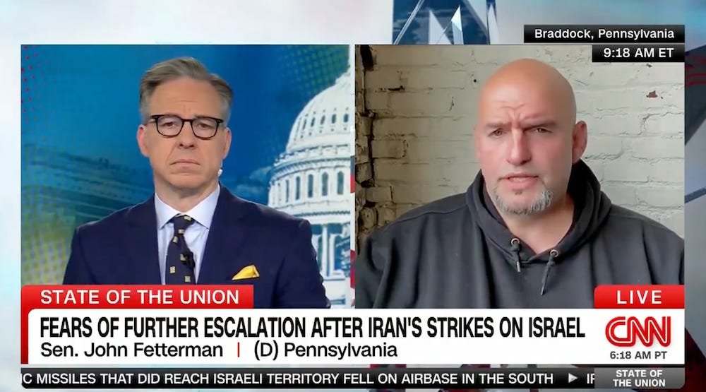 Take, for instance, everyone’s favorite hoodie-wearing Israel weirdo, John Fetterman. He dialed in from what appears to be some kind of underground bunker at his Pennsylvania home to tell Jake Tapper that the worst thing anyone could do right now was to tell Israel to dial it back even a smidge. Watch his comments after the jump.