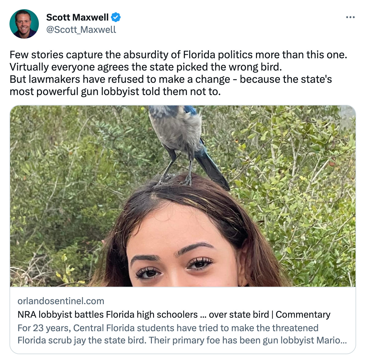 In brief, the National Rifle Association and other private interests are largely responsible for keeping the northern mockingbird installed as the Florida state bird: