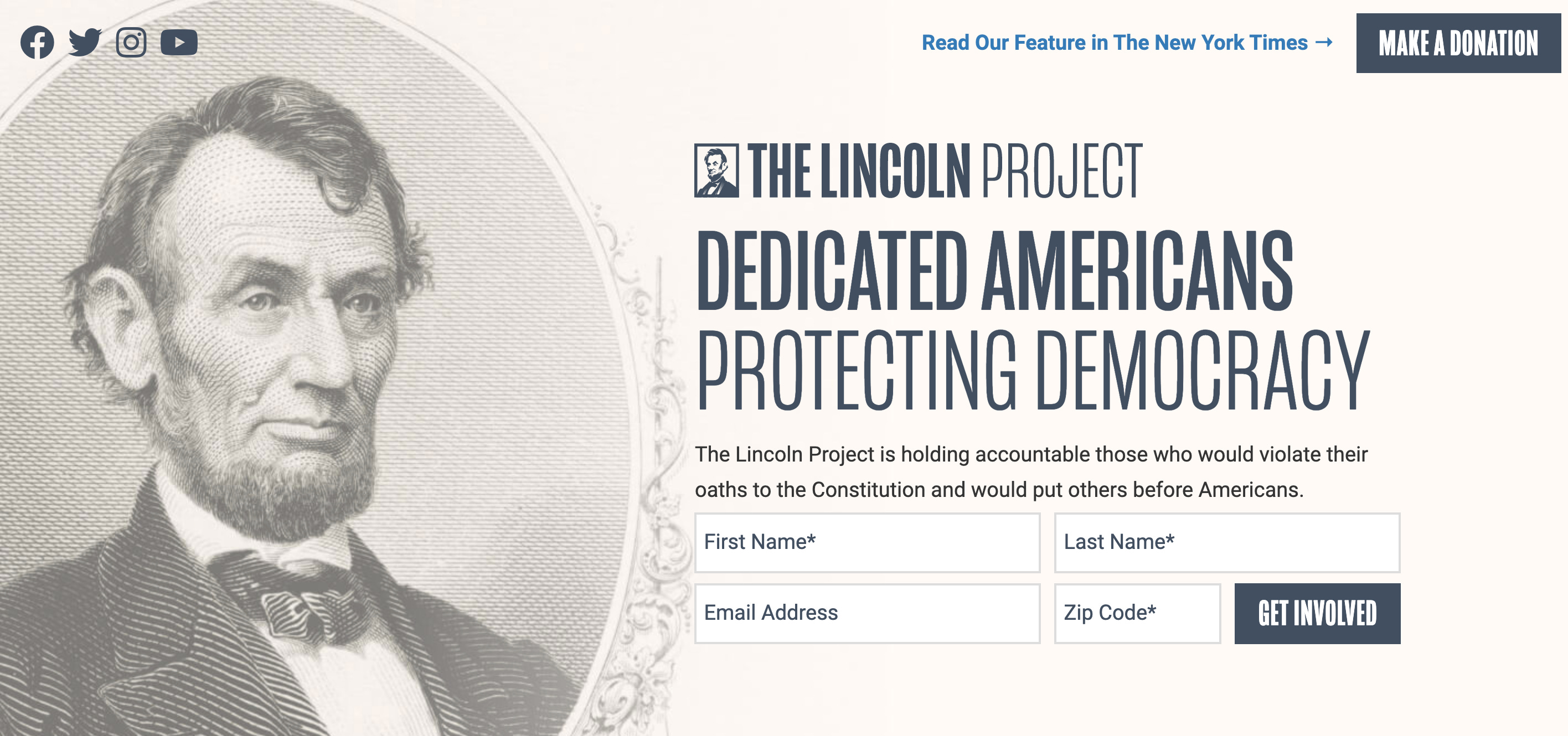 I’d been sort of vaguely aware of The Lincoln Project before this week. It’s a group run by about 8 of the 20 #NeverTrump Republicans still alive and kicking, and its mission is to defeat Donald Trump in the name of true conservatism or honor or some shit like that. In short, they’re the kind of Republicans for Biden that Uncle Joe has been thirsting for.