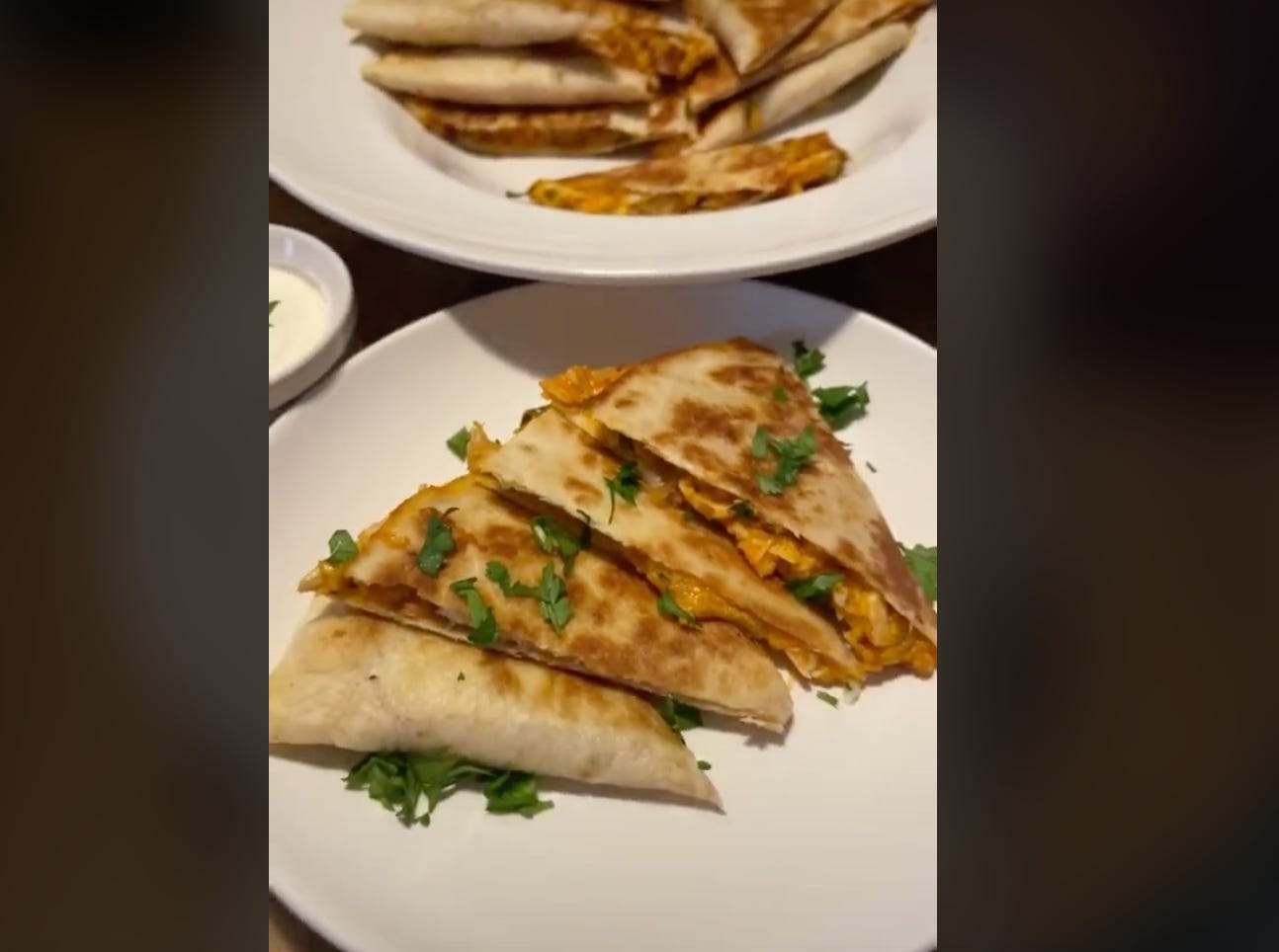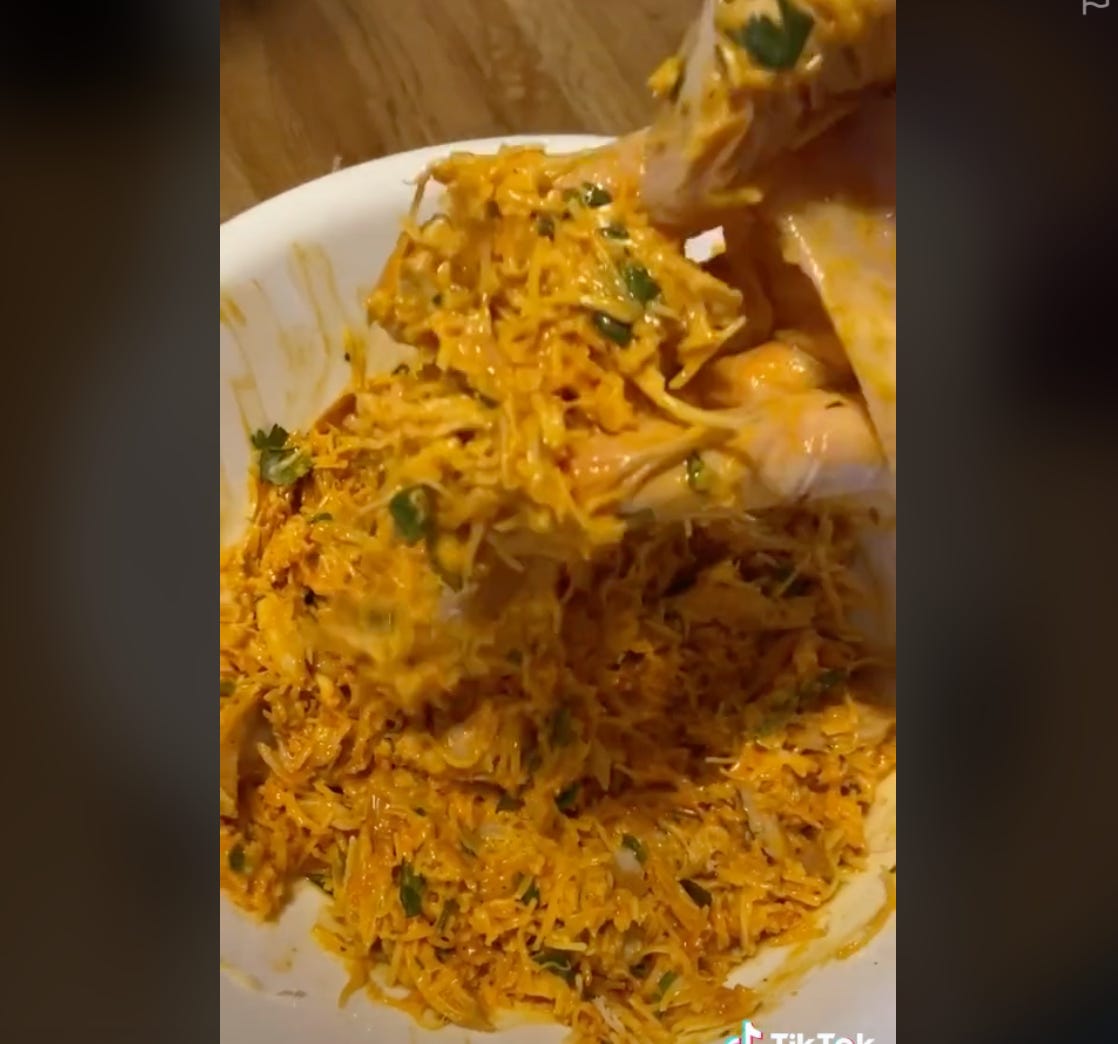 I am a white person from the Midwest who likes Mexican food, so I love nachos and quesadillas. Sue me, I am who I am! This is to explain why this monstrosity caught my eye. I mildly like Buffalo sauce (usually on wings) and do not much care for ranch, but when this teen creator said “trust the process, OK??” I trusted the process. It helped that I had a going-downhill rotisserie chicken already in my fridge, begging to be made into buffalo chicken quesadillas.