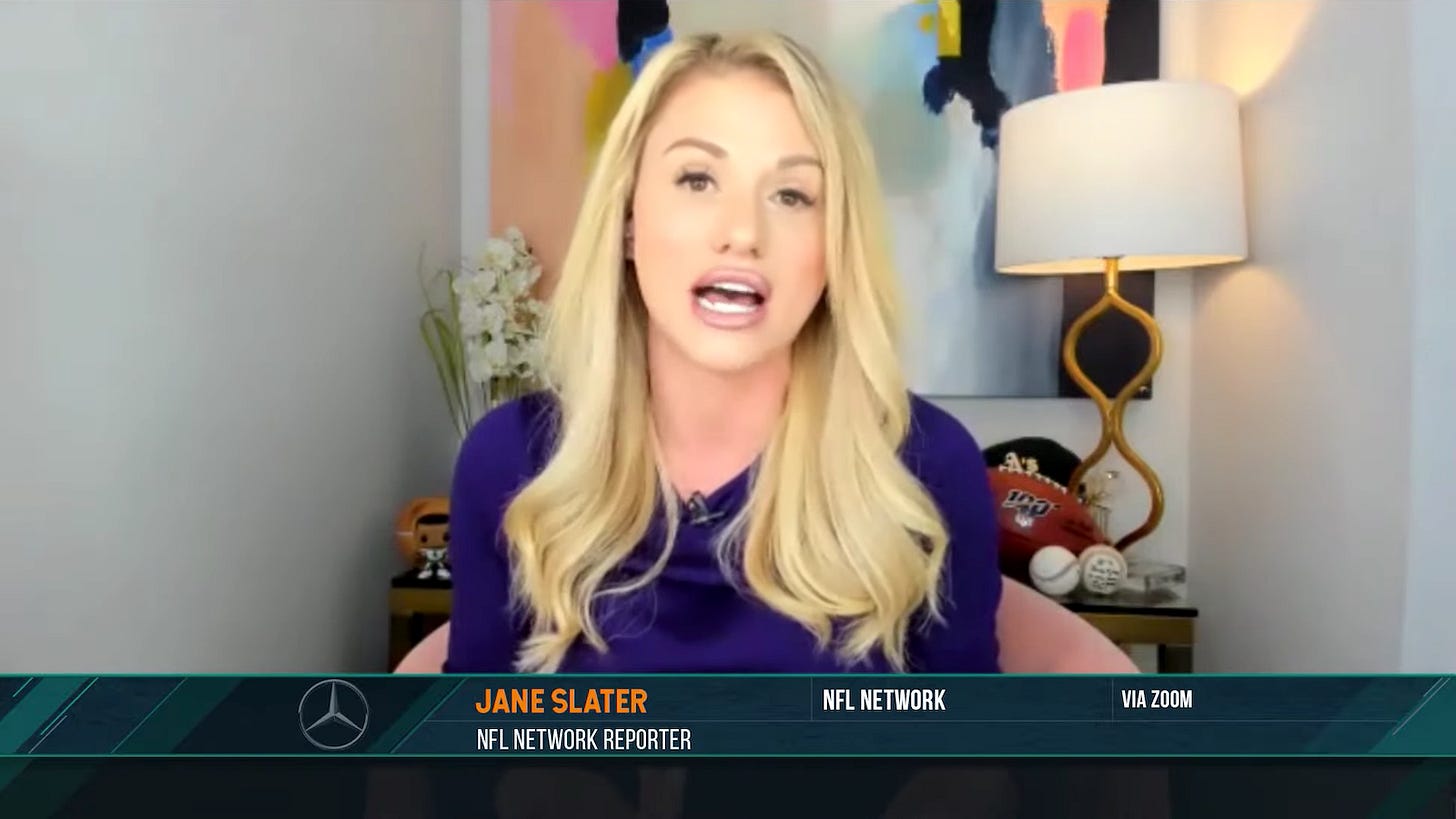 This week's unpaid internship narrative has been kindly revived by Jane Slater, a reporter for the NFL Network who, like me, went to the University of Texas at Austin (though decades before I did), and caught flack yesterday for promoting unpaid work on Twitter.