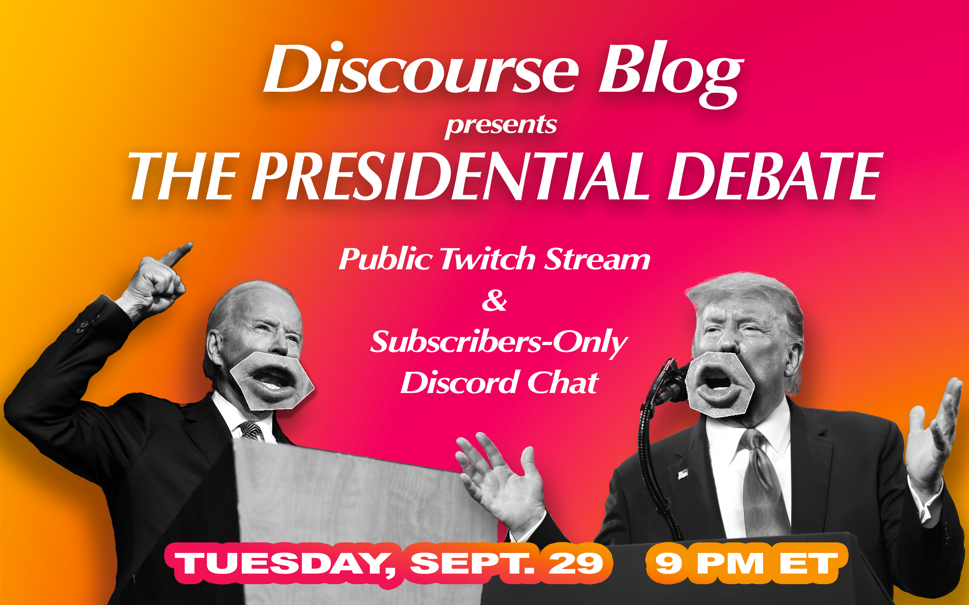 Discourse Blog will be hosting a live Twitch stream and Discord chat at 9 p.m. ET during Tuesday night’s presidential debate. (For the uninitiated, Twitch is a live video streaming service and Discord is a community chatroom program.)