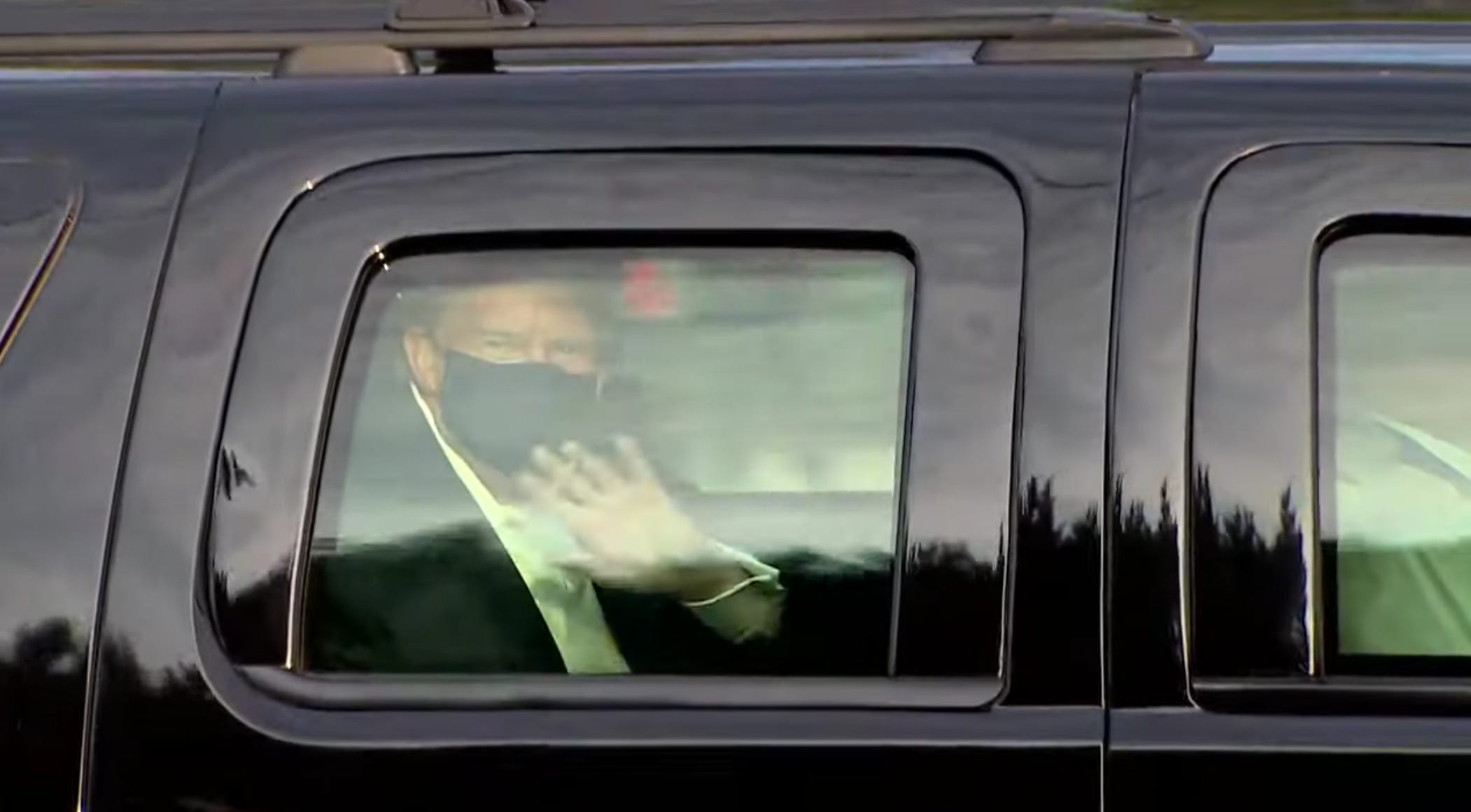 Update, 7:58 p.m. ET: Trump is now back at the White House, where he ostentatiously removed his mask in front of the cameras even though, you may have heard, he still has an infectious disease coursing through his veins. He was clearly trying to project an image of invulnerability, and boy did it work! Check out how great he looks: