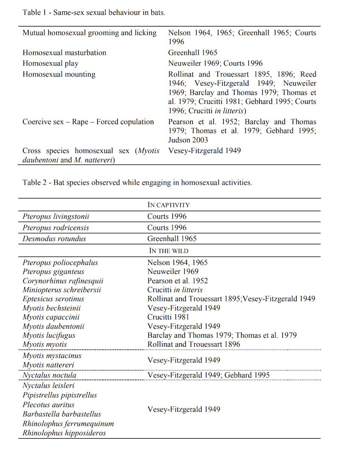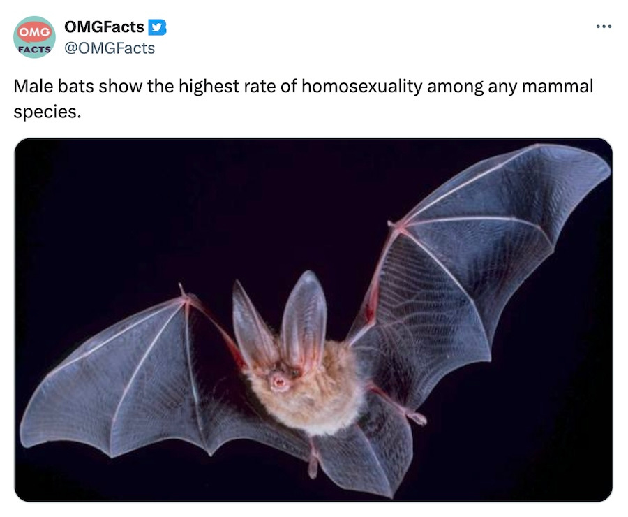 Is OMGFacts correct about this completely unsourced assertion? Not from what I can tell. But are bats very gay? 10000 percent. One Italian study says that at least 22 species of bats have been known to engage in same-sex behavior. Here is a hilariously detailed compendium from that study.