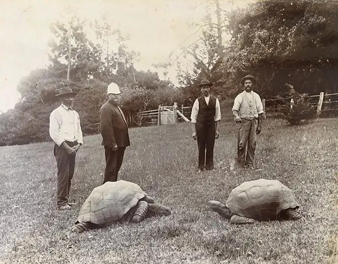 This is Jonathan, a Seychelles giant tortoise. Jonathan is currently 191 years old—the oldest living land animal on the planet. He lives on the island of St. Helena, and, even though he is blind and has no sense of smell, he is still going strong. Here’s Jonathan in a picture from 1882!!!