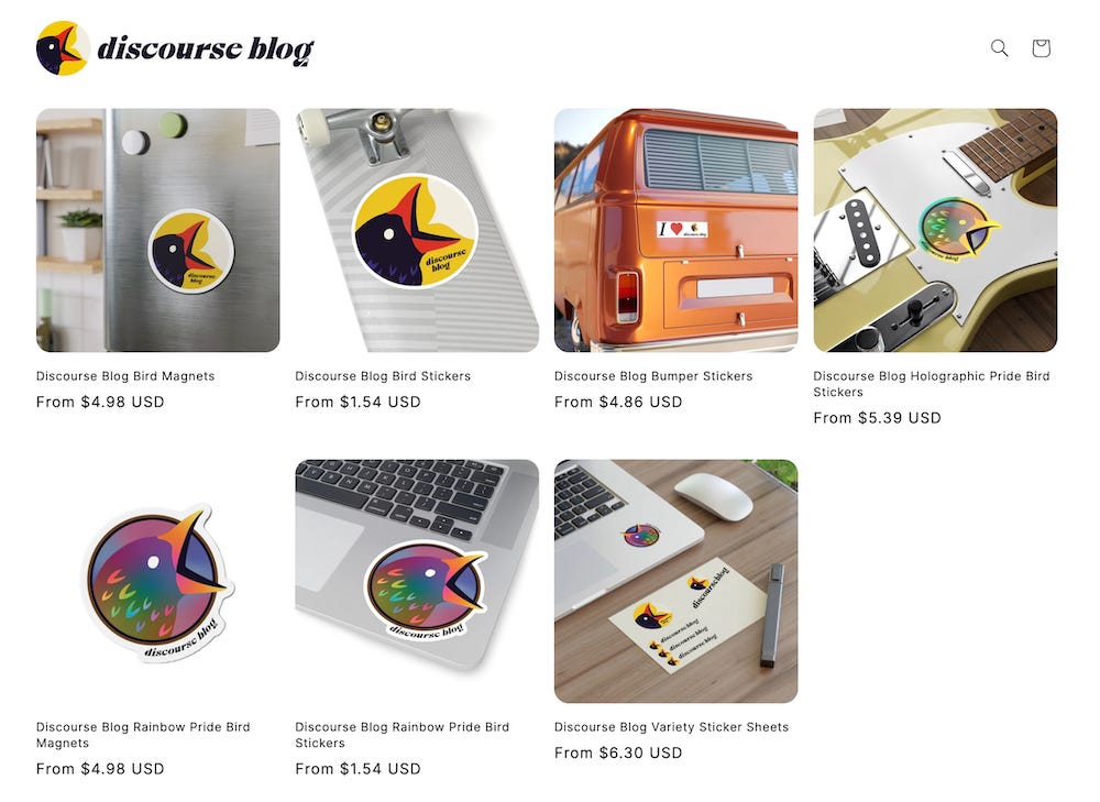 And that’s not all. We have stickers of our regular bird logo, and magnets, and bumper stickers, and even more stuff.