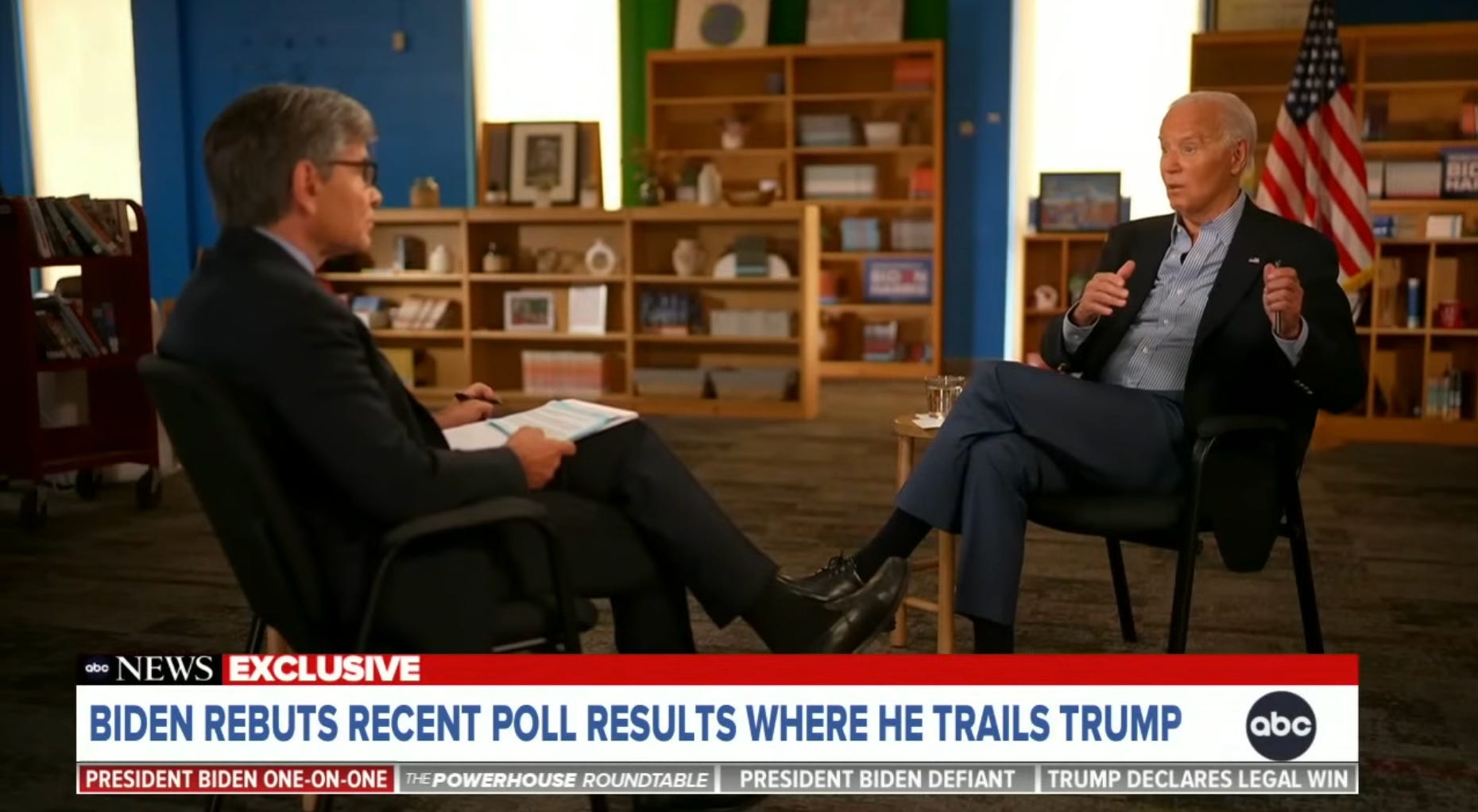 I can’t begin to speculate on Botox or facelifts (we’ve been there, done that), but in the 14 days since the debate, Biden has taken on a particularly, uh, burnt appearance. It’s a road he’s been heading down for some time already, but we’ve really hit new levels recently. Just look at him during his interview last week with George Stephanopoulos, in which he almost seamlessly blends in with the tan bookshelves behind him. It’s sort of eerie!