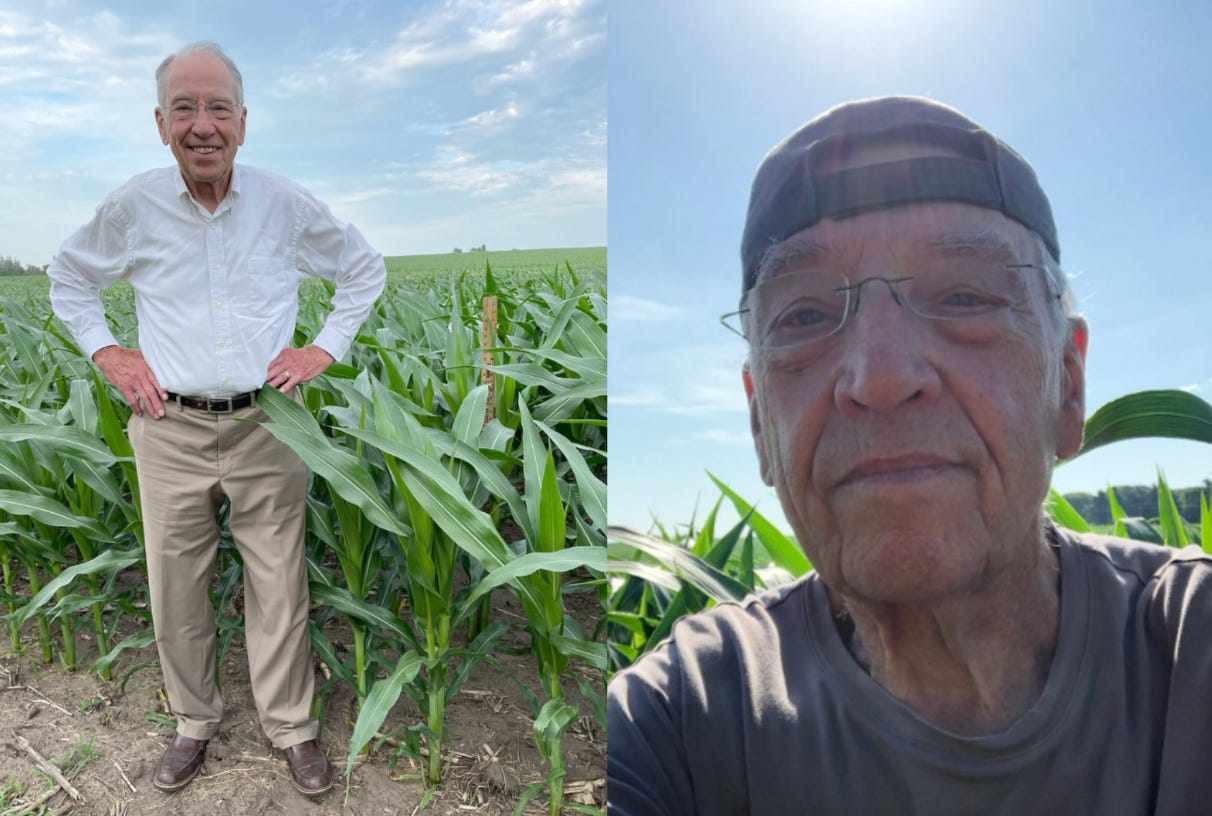 What baffles me, however, is this series of tweets from Iowa Republican Sen. Chuck Grassley, boasting about his big tall mutant stalks. Here’s Tweet one, posted on July 3rd, featuring the octogenarian lawmaker posing triumphantly in his own personal field of dreams.