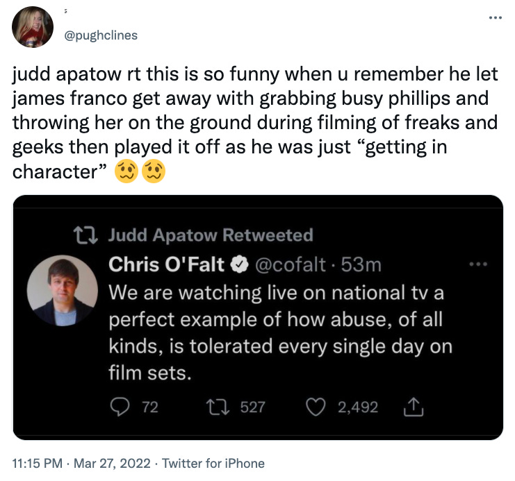 It feels ridiculous that the slap has taken on a life of its own, decimating just about anyone who dare get in its path. Remember in the early-to-mid 2010s when it became popular interview practice to ask female celebrities if they were feminists, leading to immense backlash if they said they weren’t or framed feminism in a negative light? This feels a lot like this, where famous people are being asked to condemn a random and shocking isolated incident of physical violence (though I use that term very loosely), and as a result are tripping over their own sordid histories of violence, because Hollywood, and the entertainment industry as a whole, is actually very, very violent!