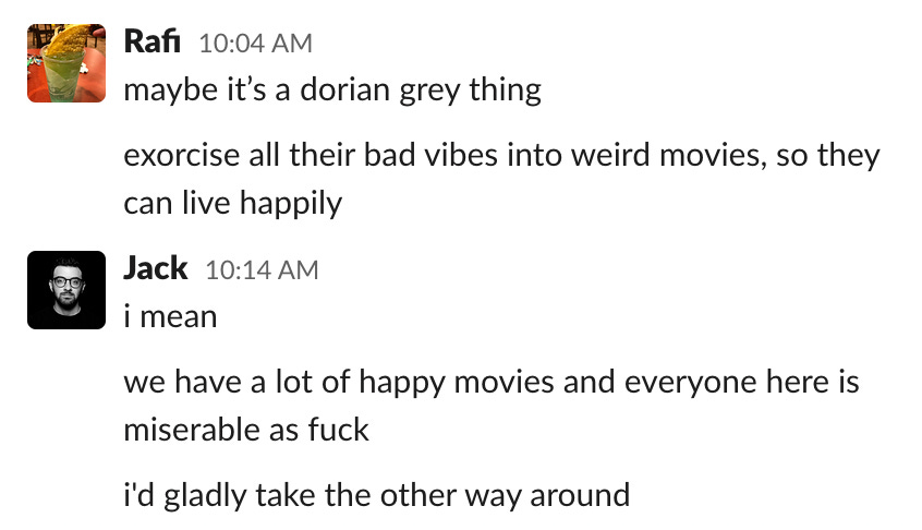 So what exactly is going on here? Are the people of Scandinavia uniquely suited to cinema that’s just a little bit fucked up and weird? Am I only aware of a particular subset of Scandinavian movies that are just a little bit fucked up and weird? Here’s more of what Rafi (and Jack) had to say on the matter:
