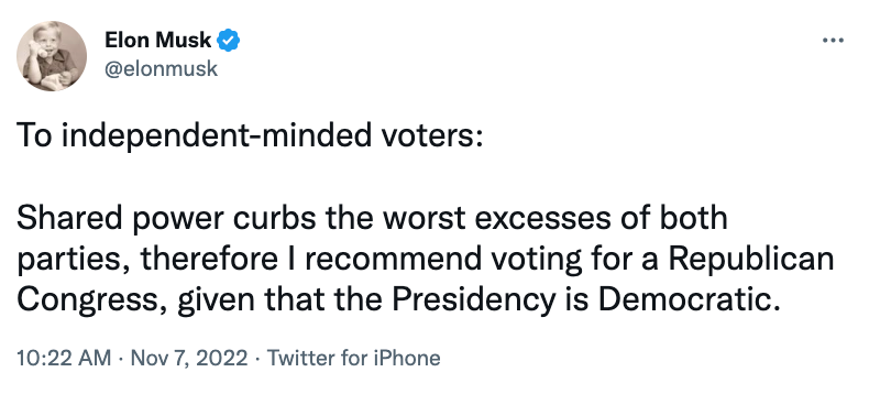 I swear I didn’t intend to mention Elon Musk today—we’ve all been thinking about him a little too much recently—but then the bastard decided to weigh in on Tuesday’s midterm elections.