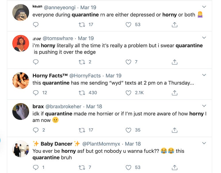 As the COVID-19 pandemic continues to spread, it’s impossible to predict the many seismic ways it will transform life as we once knew it. The problem is too vast, too deep-seated. But there’s one outcome of the virus—and the social distancing it hath wrought—that we should have seen coming from a mile away: People getting unbelievably horny on the TL.