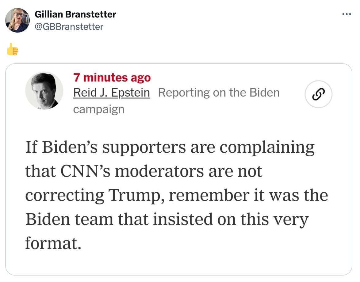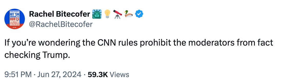 I am angry at a campaign that is so insular, arrogant, and incompetent that it proactively engineered this catastrophe. This whole thing—from the date to the venue to the outlet to the rules—was the Biden team’s idea. Everyone was rightfully fuming that CNN’s Jake Tapper and Dana Bash (which, by the way, thanks, CNN, for rewarding her disgraceful racist anti-Palestinian propaganda with this plum gig) asked terrible questions and didn’t do anything to rein in Trump’s endless string of lies. Well: